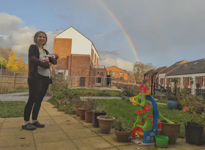 Chapeltown Cohousing in the sun, plus Katy and Rosa being surrounded by a rainbow