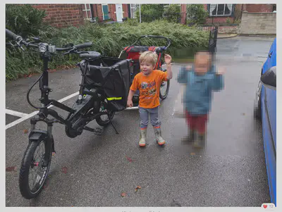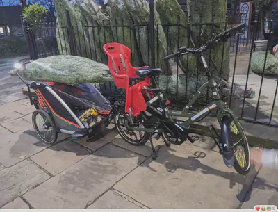 Chapeltown cohousing’s shared electric bike, plus happy travellers on their way home on the nursery run.