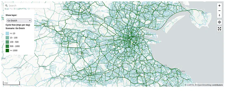 This paper describes an approach for developing strategic cycle network planning tools. Based on our experience developing and deploying the Cycle Route Uptake and Scenario Estimation (CRUSE) Tool for Ireland, we outline the underlying methods, including disaggregation of origin–destination data with the open source ‘odjitter’ software, incorporation of additional trip purposes, routing, scenario generation, and development of an intuitive user interface that is tested and used by practitioners. Commissioned by the national infrastructure agency Transport Infrastructure Ireland, CRUSE provides estimates of current and potential future cycling levels under ‘snapshot’ scenarios to inform investment decisions. The publicly available results at https://cruse.bike/enable planners, engineers, and other stakeholders to make more evidence-based decisions. CRUSE goes beyond previous work by: modeling networks at high spatial resolution; simulating multiple trip purposes (social, shopping, personal utility, recreational, and cycle touring), supplementing official origin–destination datasets on travel for work and education; and providing estimates of ‘quietness’ (a proxy for cyclist comfort and route preference) at the route segment level. Three network types—‘Fastest’, ‘Balanced’, and ‘Quietest’—help plan both arterial and residential cycle networks. Workshops with stakeholders were used to inform the development of the tool. Feedback shows that the tool has a wide range of uses and is already being used in practice to inform urban, inter-urban, and rural cycle network designs. The approach is flexible and open source, allowing the underlying ideas and code to be adapted, supporting more evidence-based and effective cycling policies and interventions internationally.