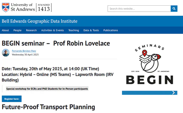 This is part of the St Andrews Bell Edwards Geographic Data Institute (BEGIN) Seminar Series, held in the Irvine Building, University of St Andrews, North Street, St Andrews, KY16 9AL, Scotland, and hosted by Fernando Benitez.