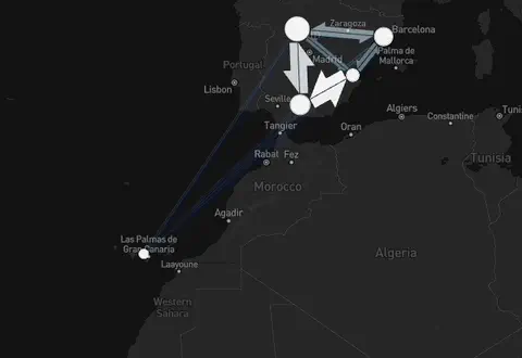Animated visualisation of daily mobility flows across Spain using data accessed via the spanishoddata package.